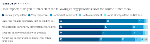 Embold Research asked voters about the importance of four major energy priorities, and large majorities – between 70 and 88% – view each of these priorities as critically or very important.  “Ensuring reliable electricity that doesn’t go out” took the top spot, with a 53% majority saying it is critically important and 36% rating it as very important.  Just over half – 51% – also view the related goal of modernizing America’s energy infrastructure and electrical grid as critically important, and a further 31% see this as very important.  For more than 8 in 10 voters – 81% – keeping energy costs as low as possible is another critically (48%) or very (34%) important priority.  Finally, while achieving energy independence from other countries is desirable for most, fewer voters see it as critically (45%) or very important (25%).