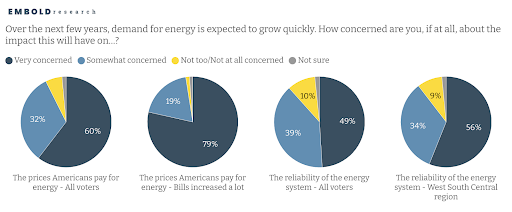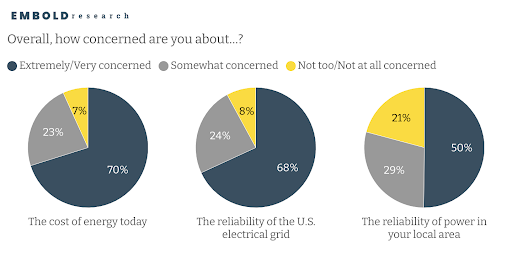 Most voters also expressed serious reservations about the energy system’s ability to deliver on these priorities.   When asked how concerned they are about the cost of energy today, 70% reported that they are extremely or very concerned.  This number was even higher – 90% – among the 3 in 10 voters who reported that their household energy bills have increased a lot over the last year.