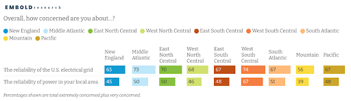 Americans’ concerns about energy reliability also vary considerably depending on where they live, with two regions standing out in particular.  Voters in the West South Central census region – Texas, Oklahoma, Arkansas, and Louisiana – expressed by far the strongest worry, with 2 in 3 extremely or very concerned about the reliability of power in their local area and nearly 3 in 4 (74%) concerned about the electrical grid more broadly.  Meanwhile, residents of the Mountain census region are notably less concerned than those living anywhere else in the country.  This region spans eight states in the Mountain West, from Arizona and New Mexico in the South to Idaho and Montana in the north.  Fewer than 4 in 10 voters in these states (39%) are extremely or very concerned about the reliability of power in their area and 56% are worried about U.S. grid reliability generally.